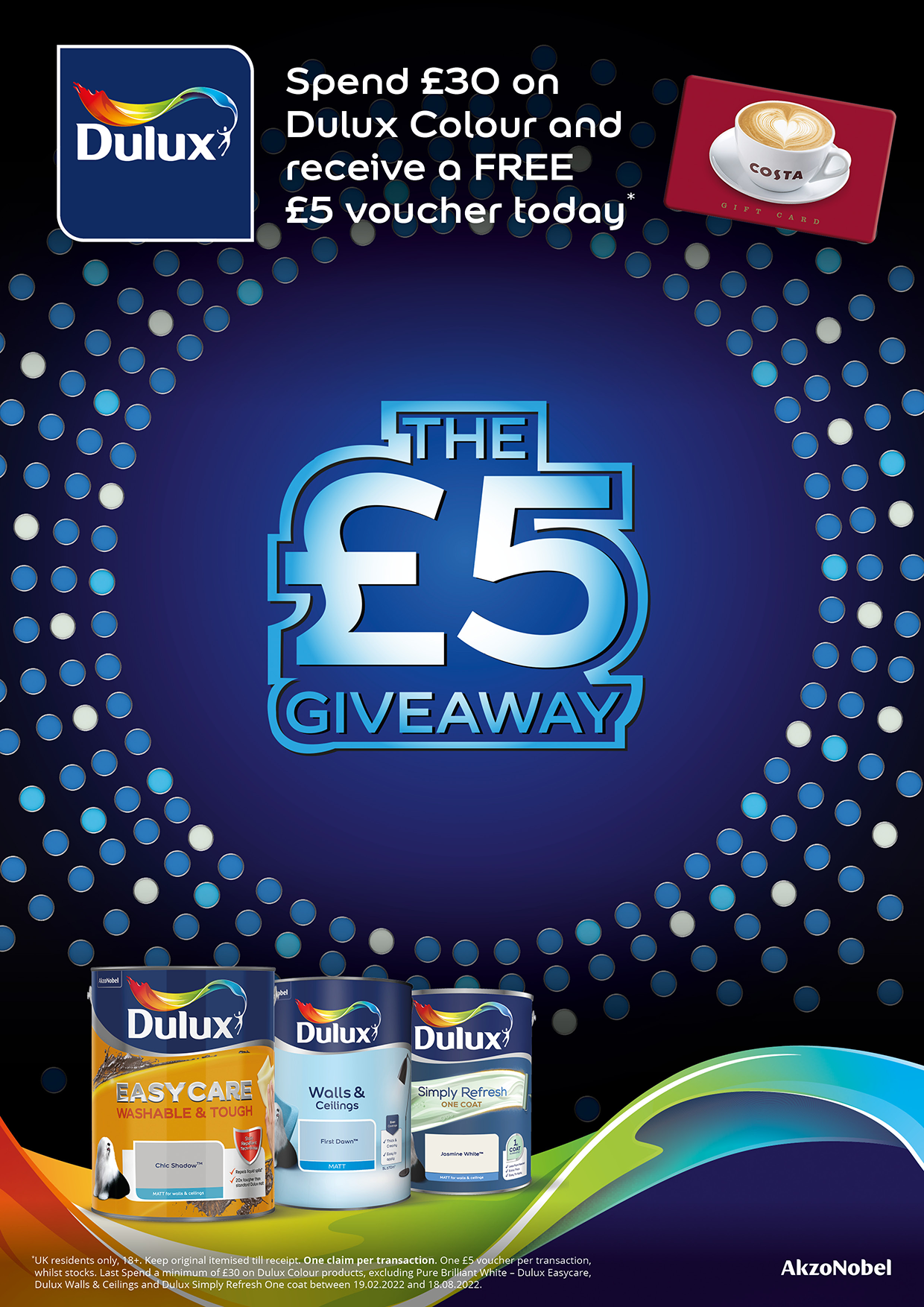 We are a Colour Advice Center for Dulux meaning we get exclusive offers for our customers. So we currently have an offer running where you will receive a £5 Gift Card to spend in any Costa Coffee, when you purchase £30 worth of Mixed Coloured Dulux Paint.